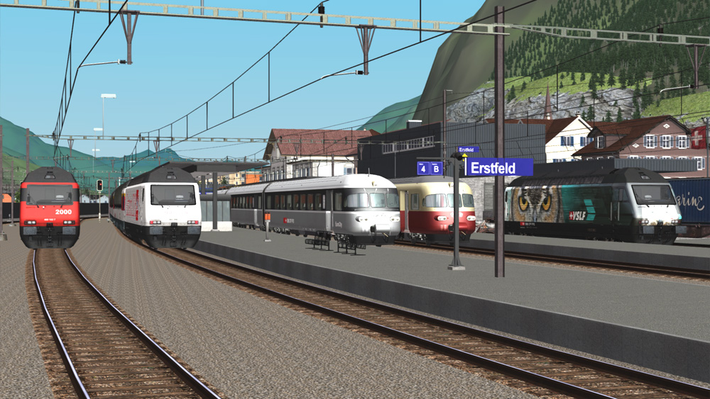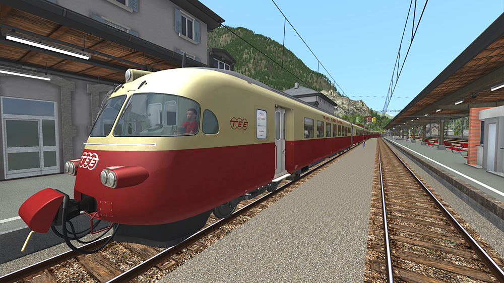 Beschreibung: Zug an Bahnsteig fahren, dann fahren TEE und graue Maus mit Ziel